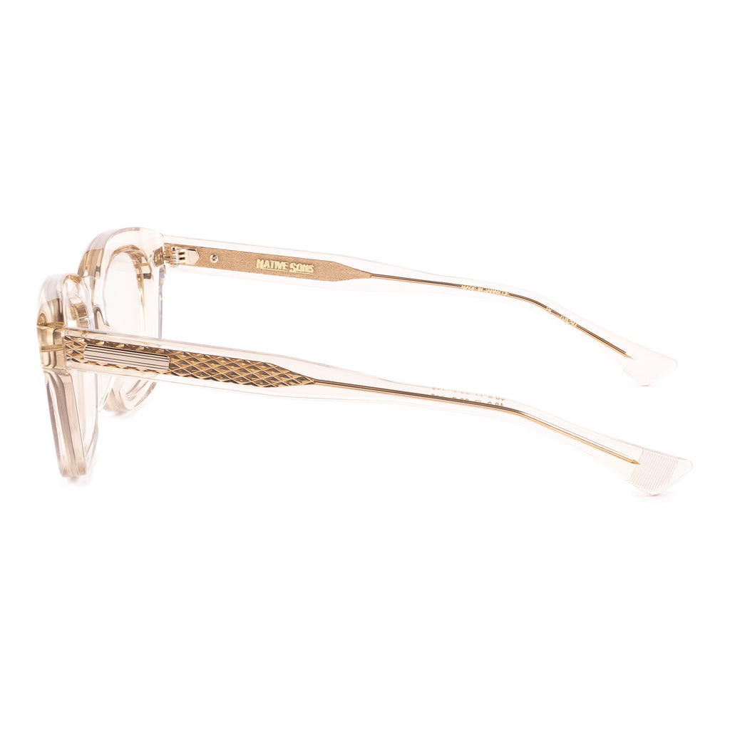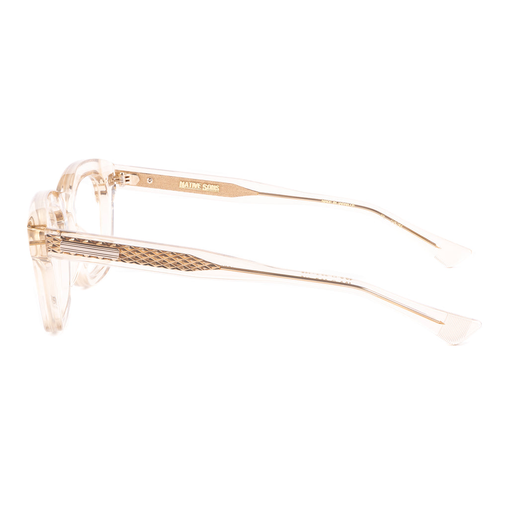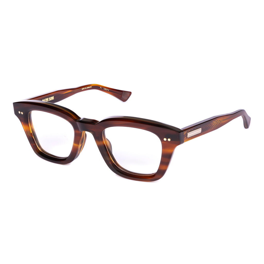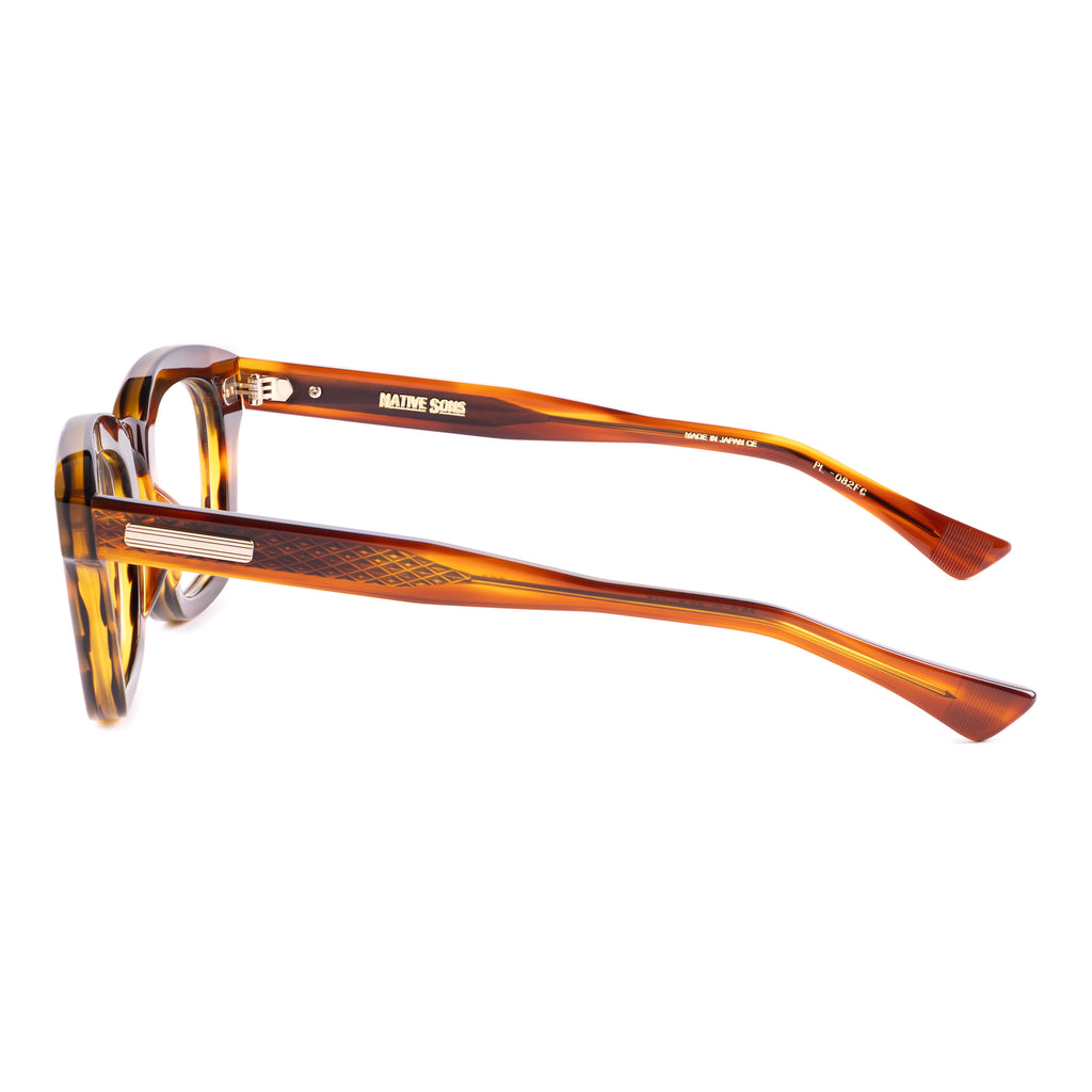 テンプルは後方に向かって四角くなり、形を整えながら耳に沿うように上下のバランスの違うテーパーラインを描いています。