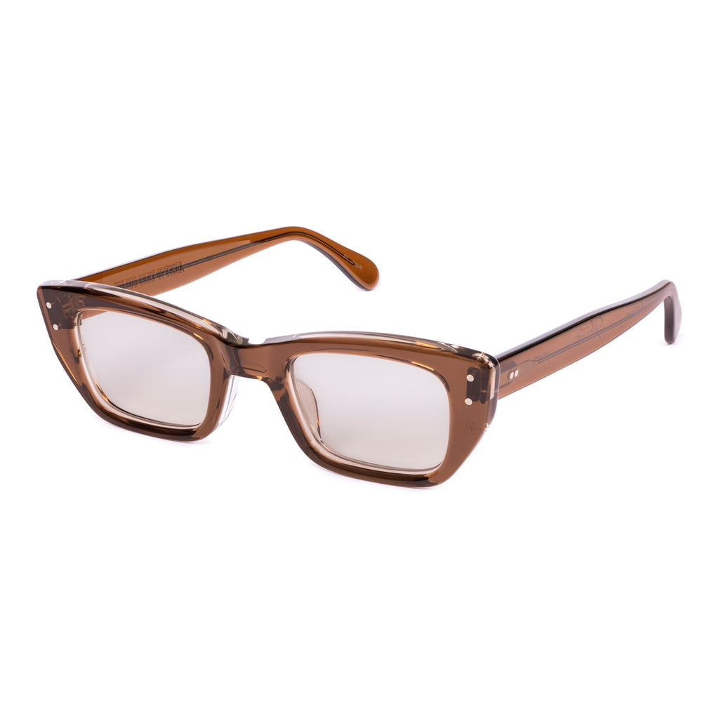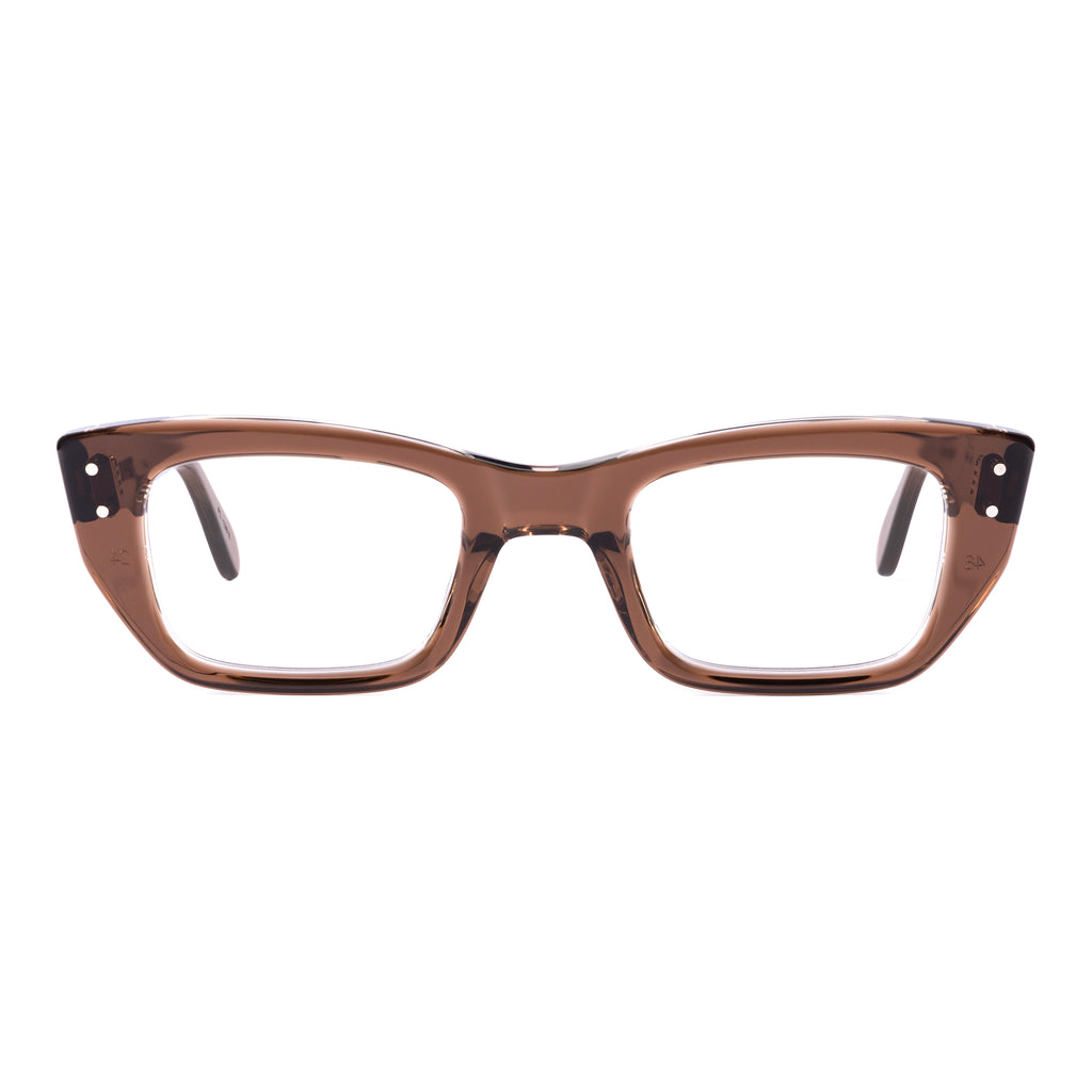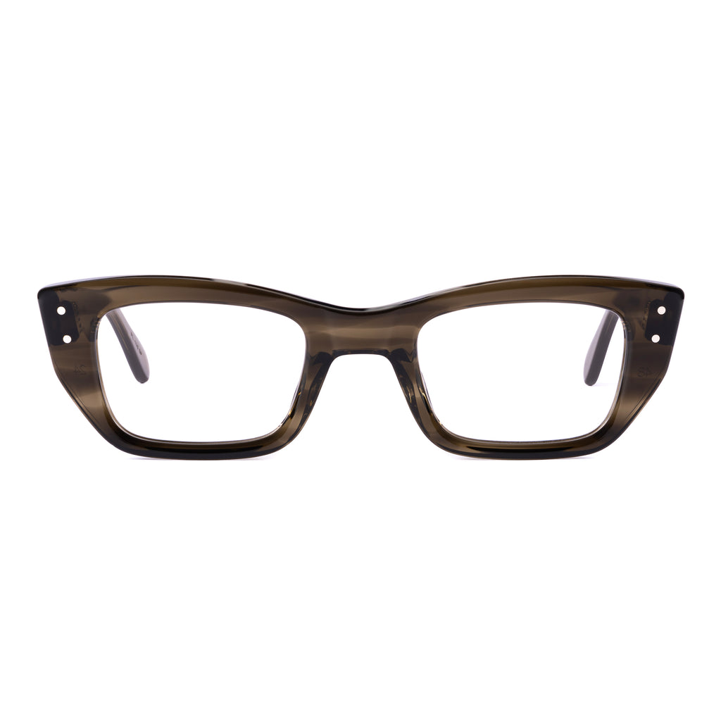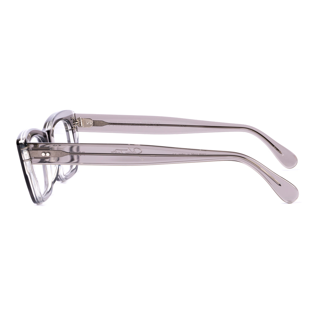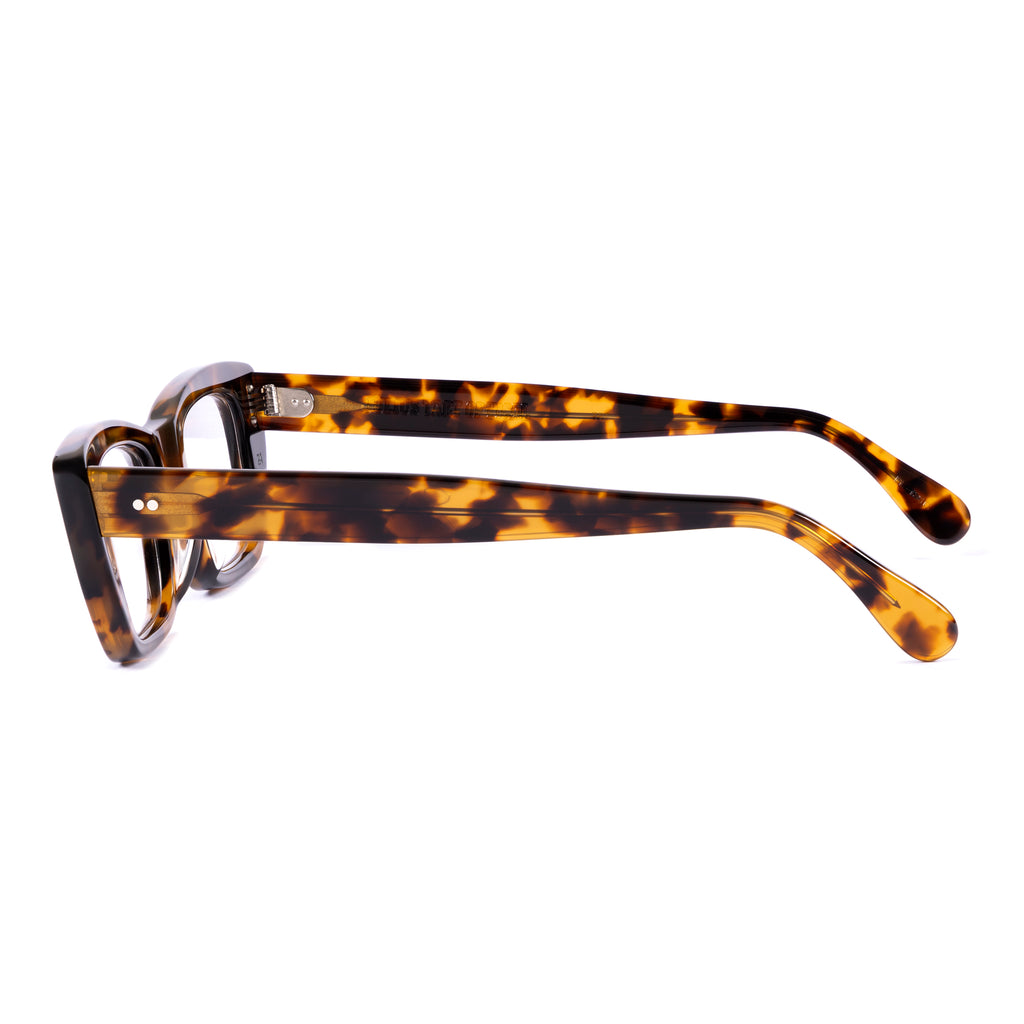 ユニークな形状のフレームで、ブロウラインが中央でノーズブリッジに向かって下がるデザイン。リムラインのサイドはスクエアに仕上げられ、下部がより急激に内側へカットされており、わずかにファラオのヘッドドレスに似た印象を与える。