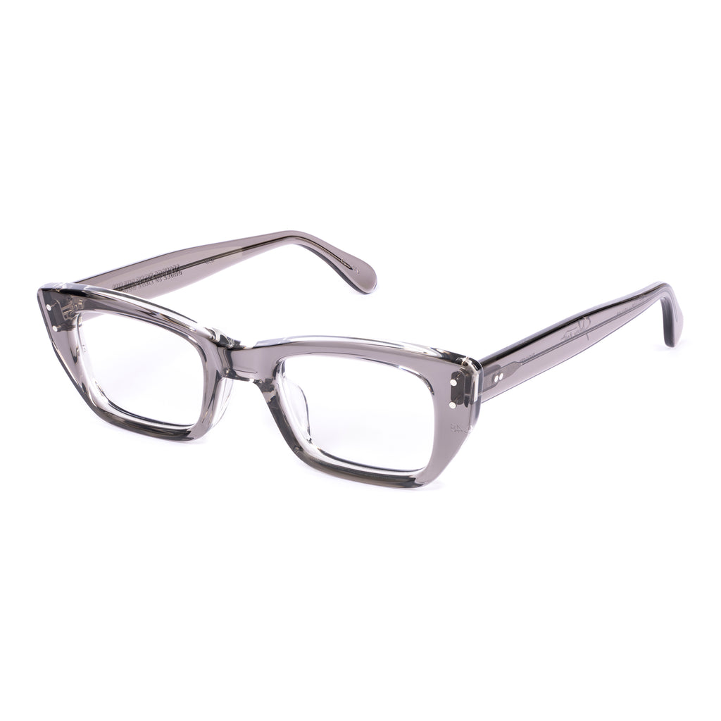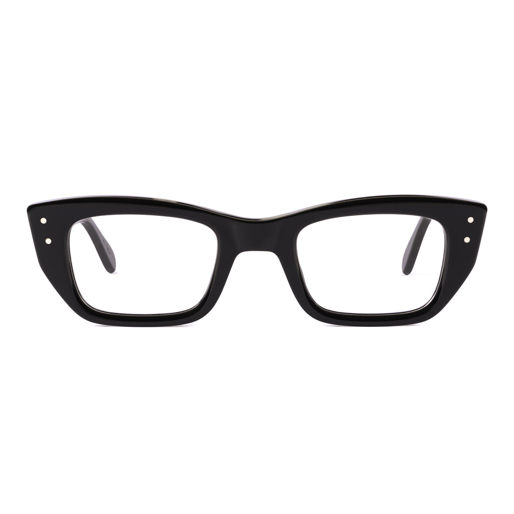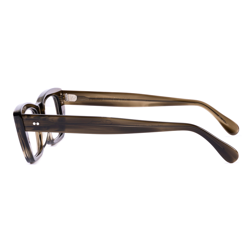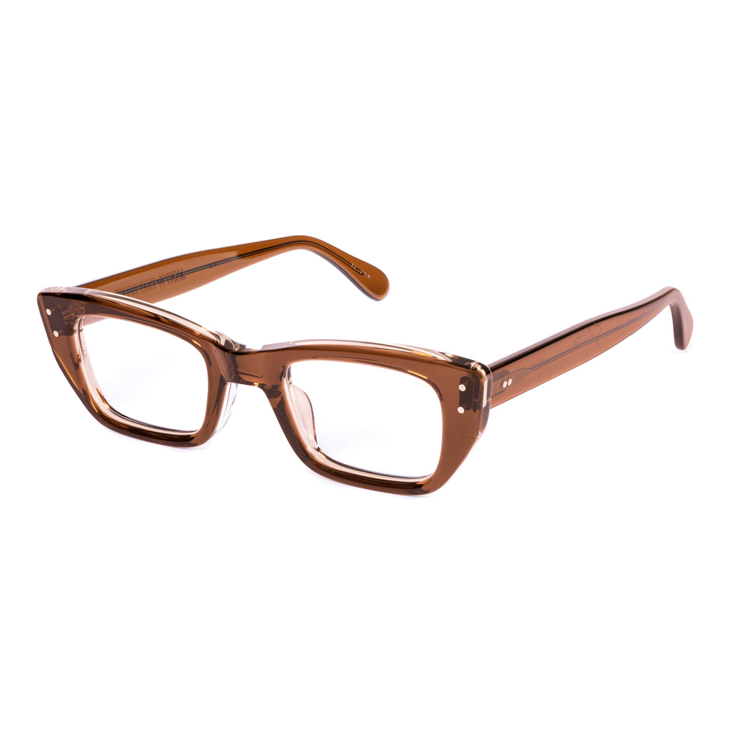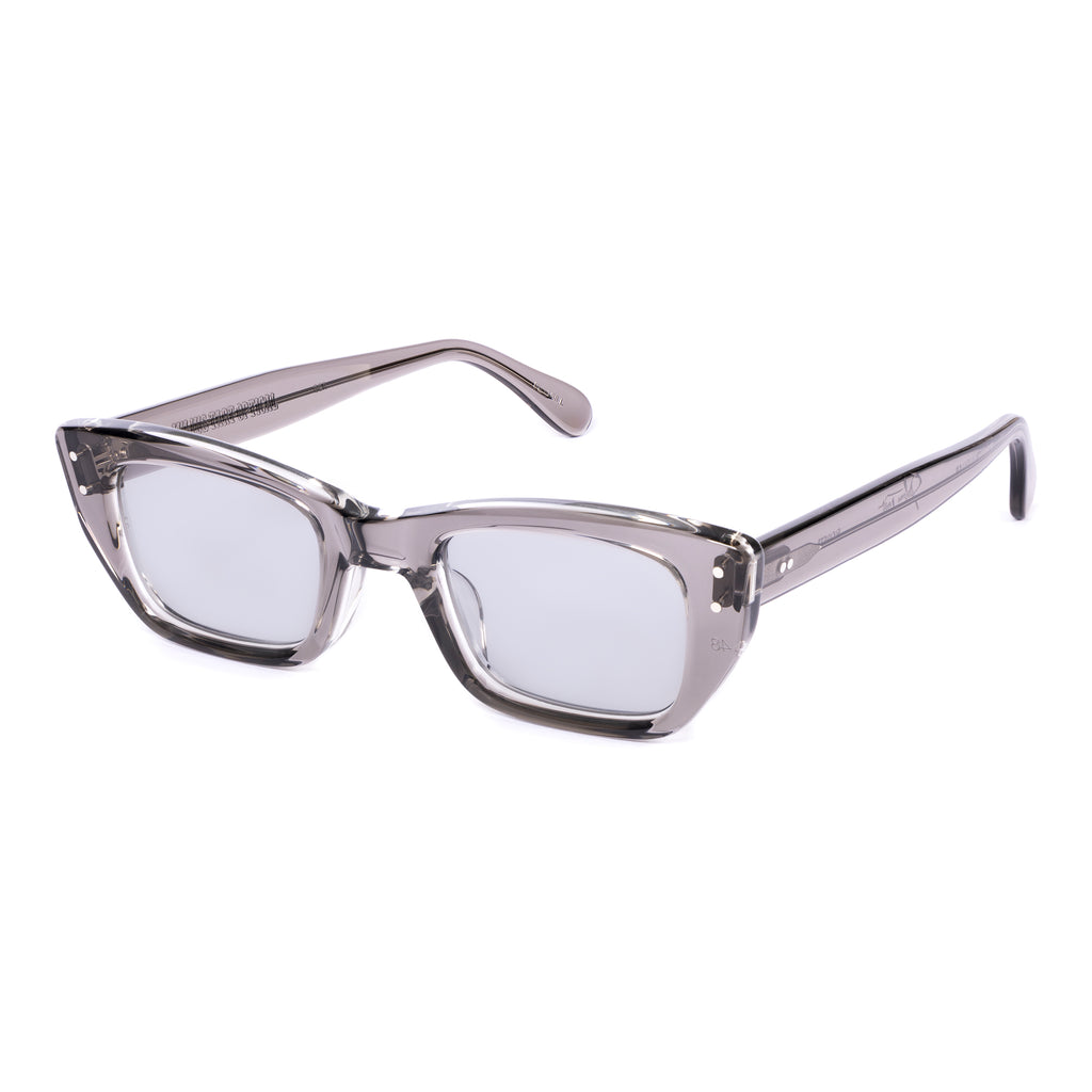 ユニークな形状のフレームで、ブロウラインが中央でノーズブリッジに向かって下がるデザイン。リムラインのサイドはスクエアに仕上げられ、下部がより急激に内側へカットされており、わずかにファラオのヘッドドレスに似た印象を与える。