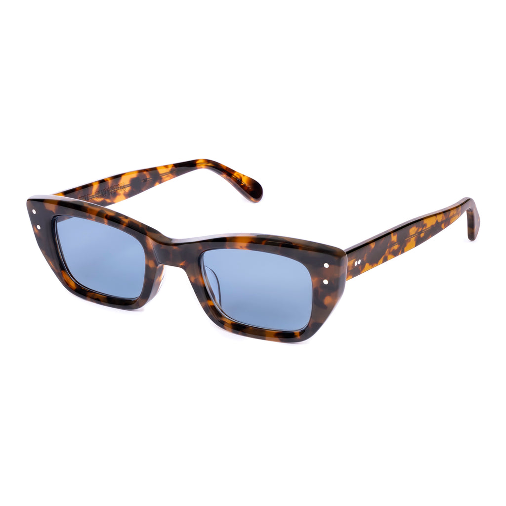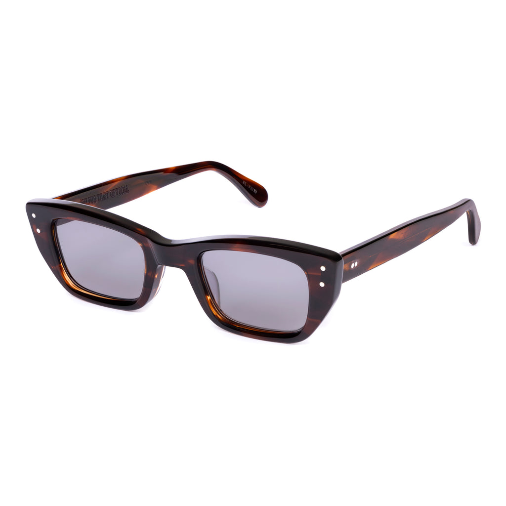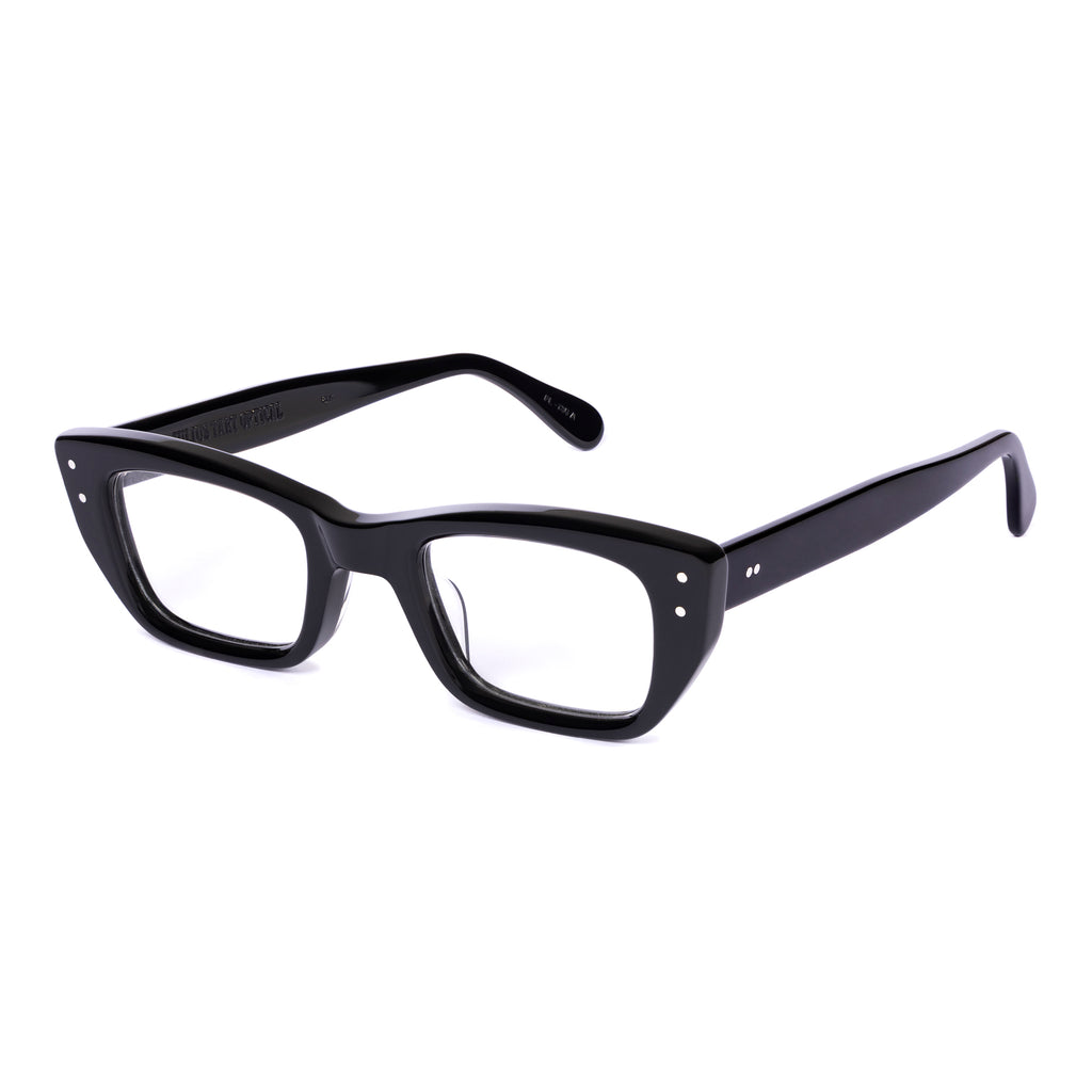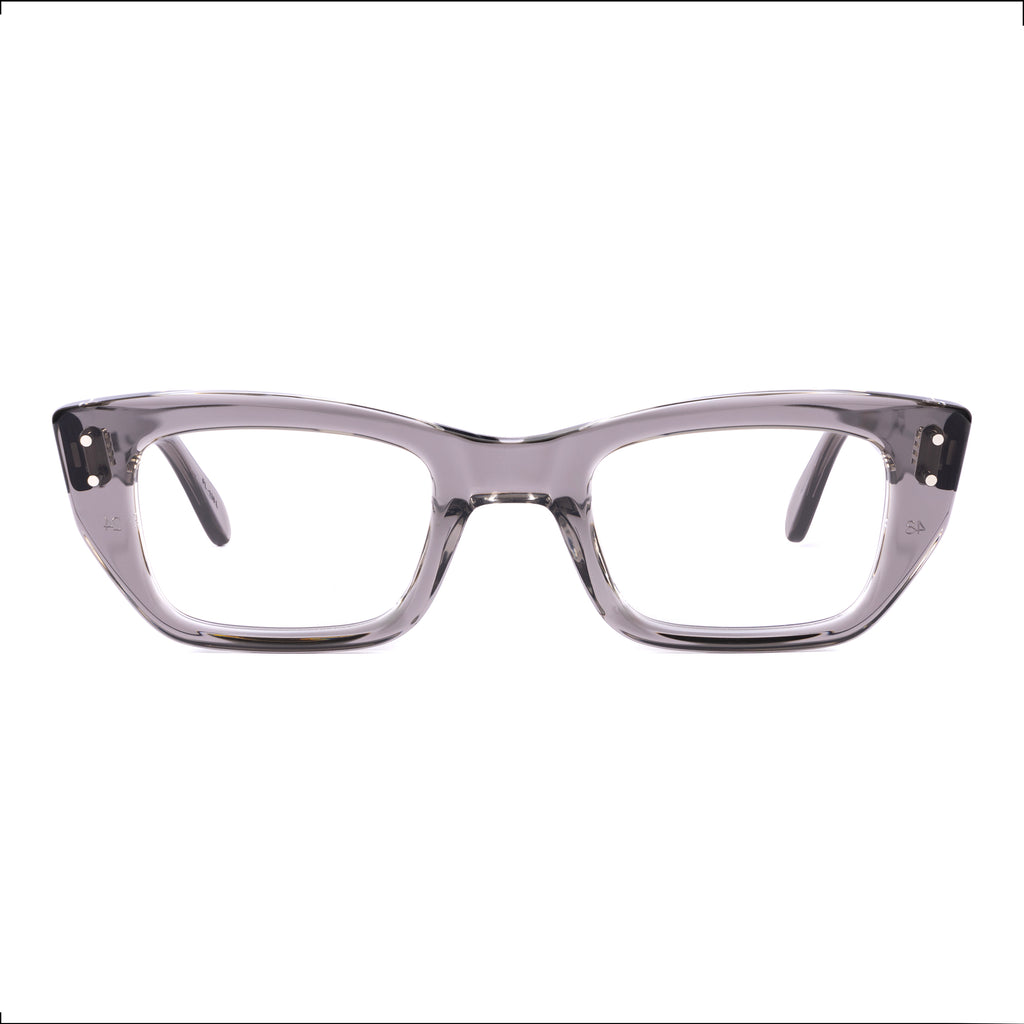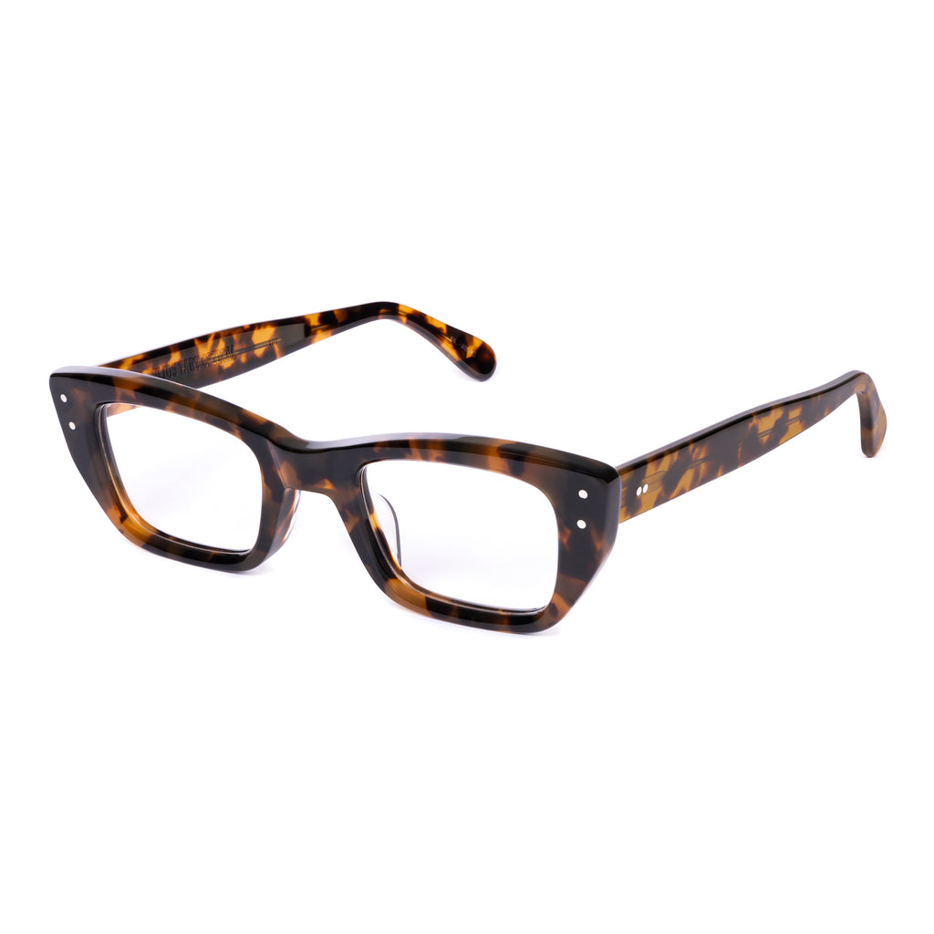 ユニークな形状のフレームで、ブロウラインが中央でノーズブリッジに向かって下がるデザイン。リムラインのサイドはスクエアに仕上げられ、下部がより急激に内側へカットされており、わずかにファラオのヘッドドレスに似た印象を与える。