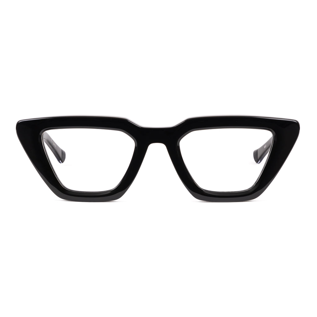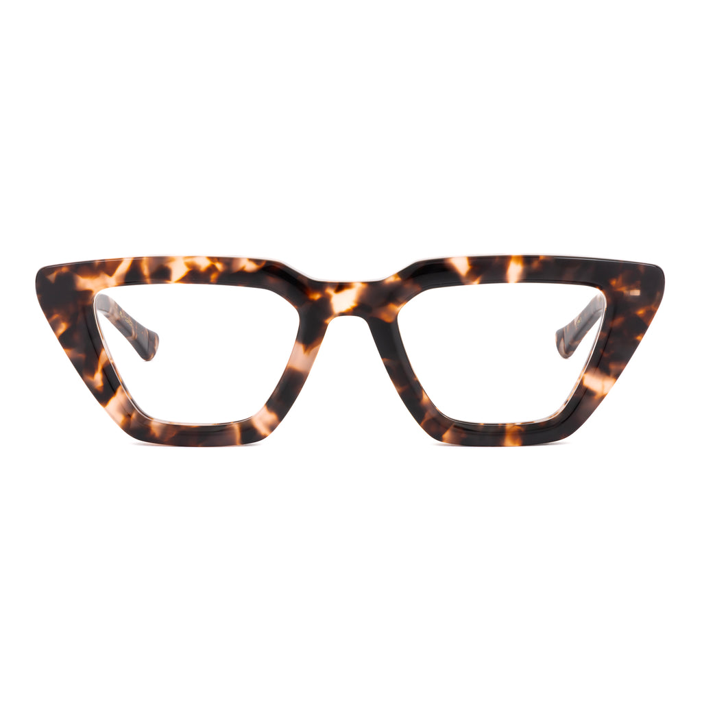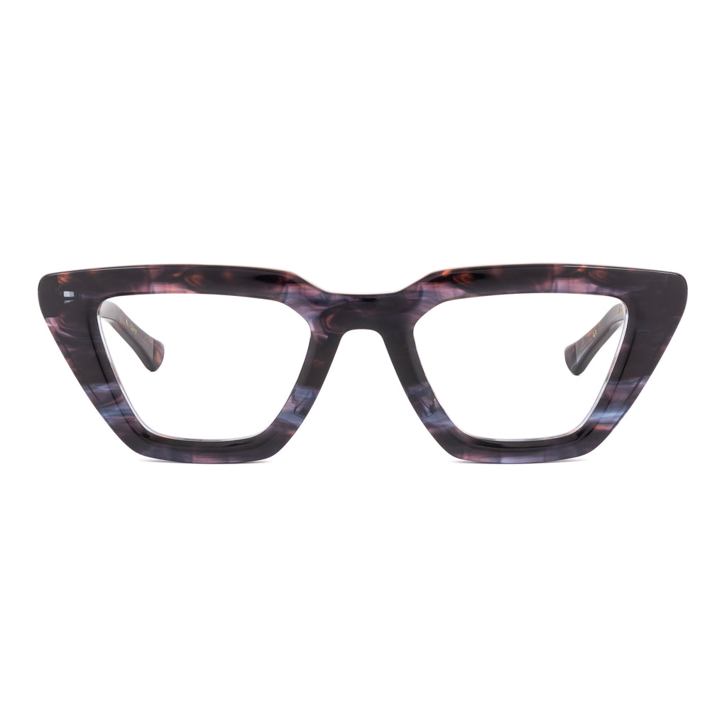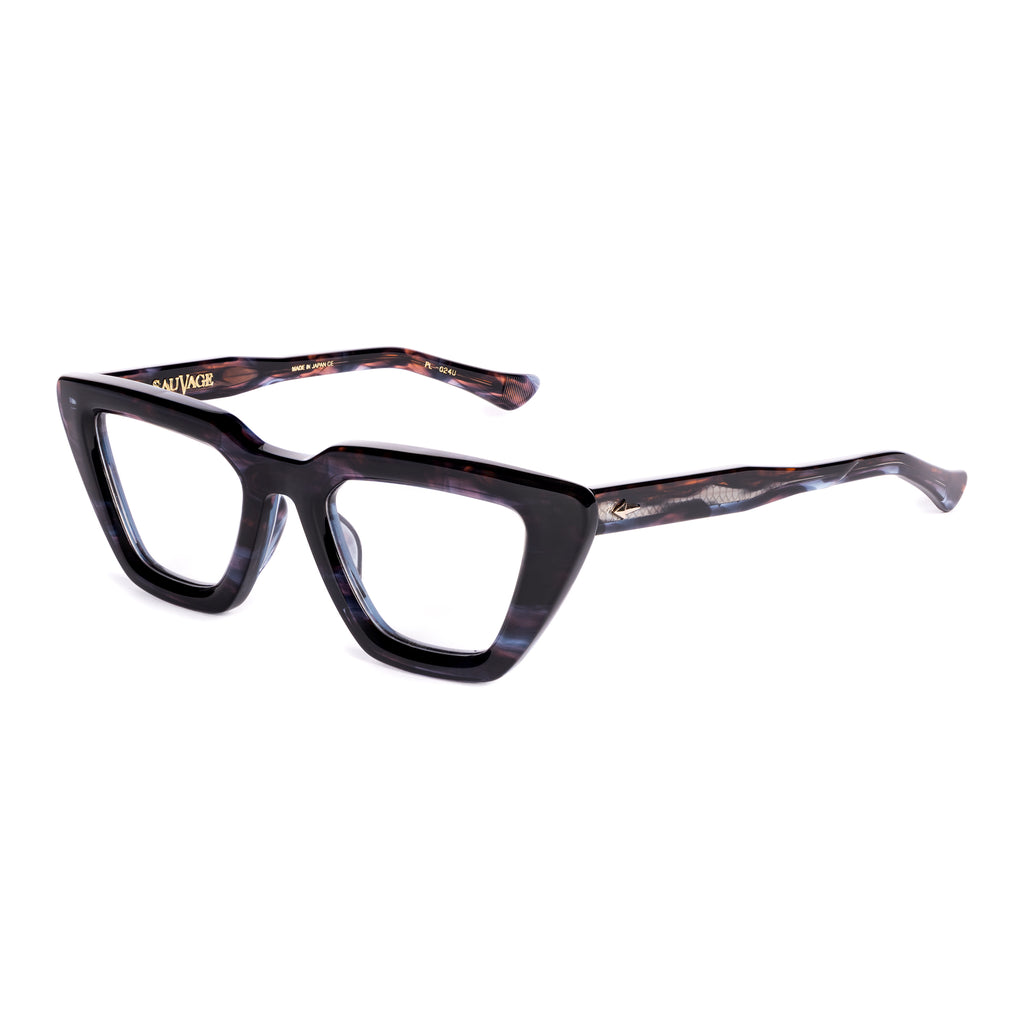 A trapezoidal shape frame drawn with straight lines, features thickened rims at the temples that are inspired by the swan's tail.