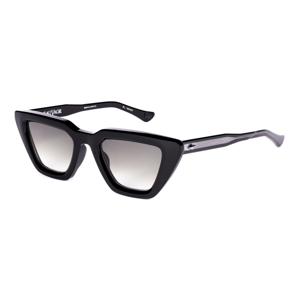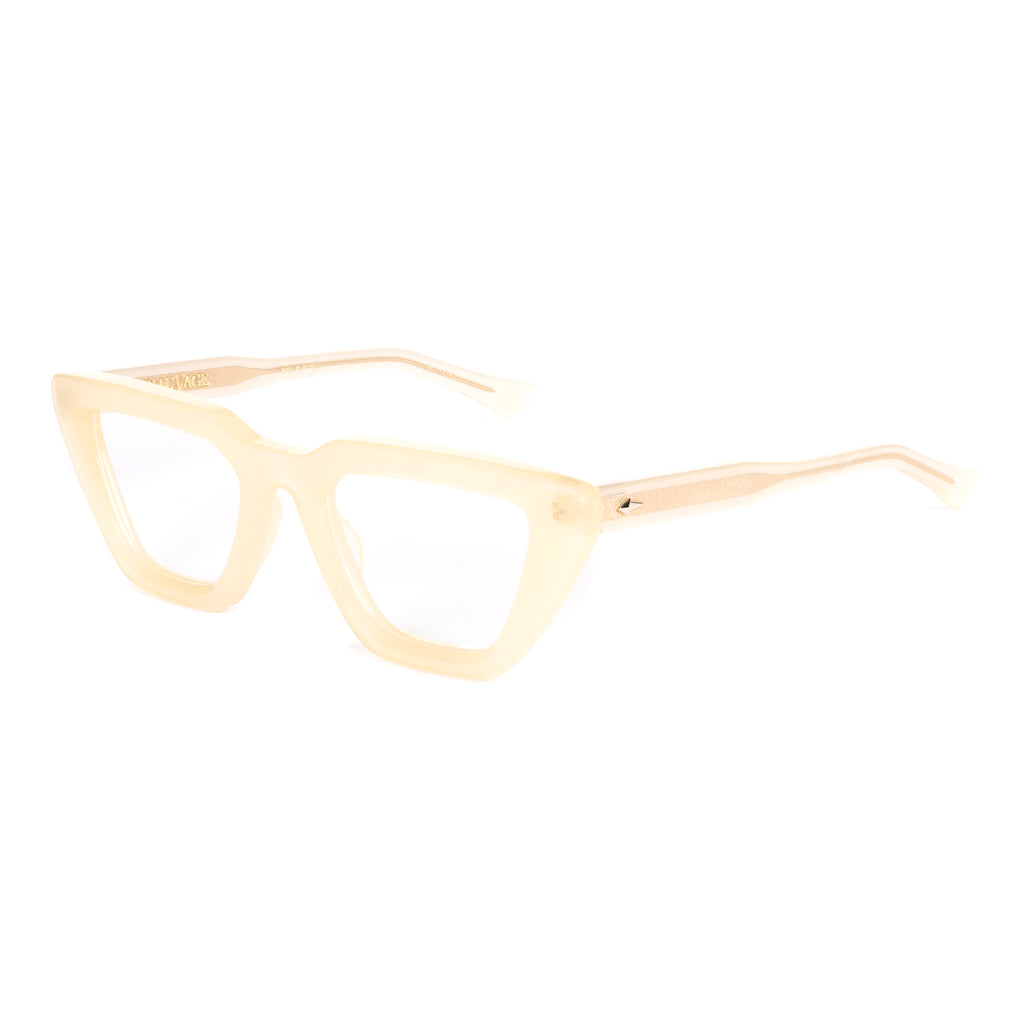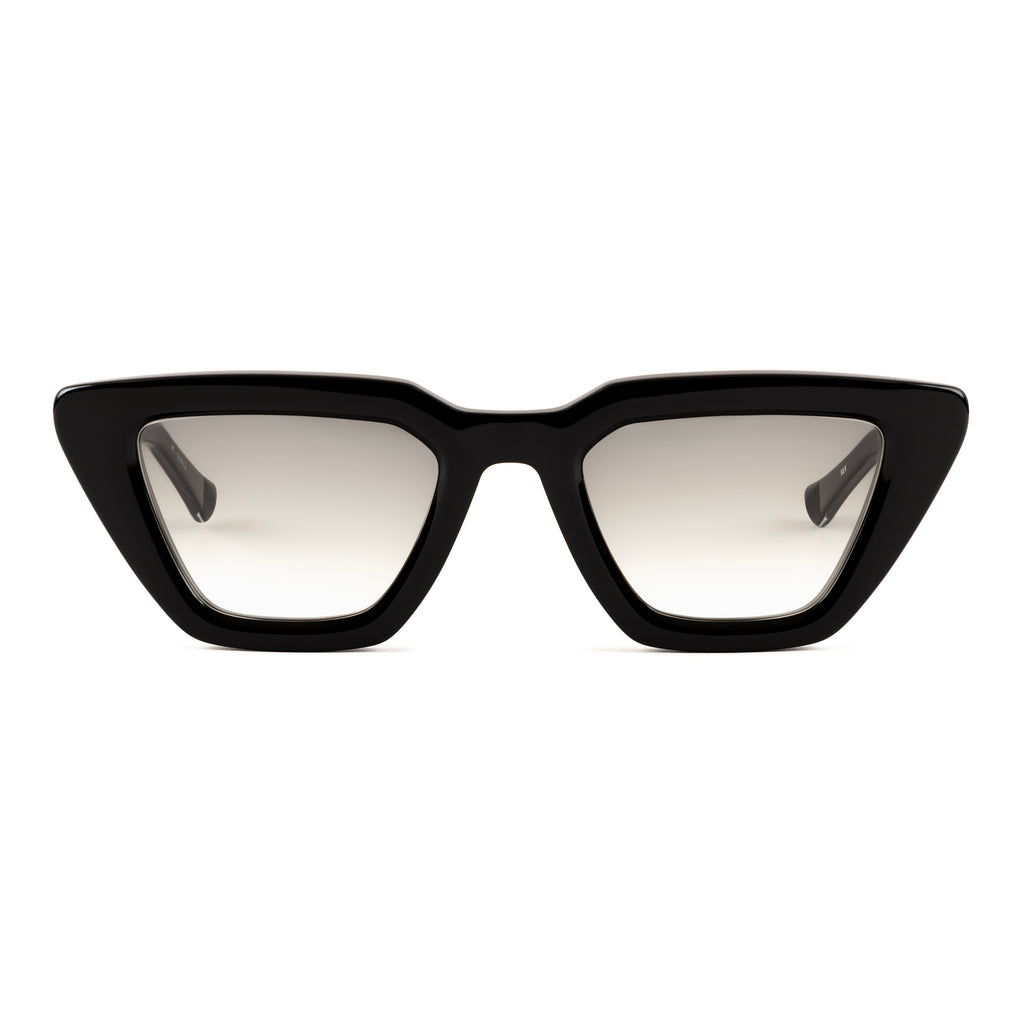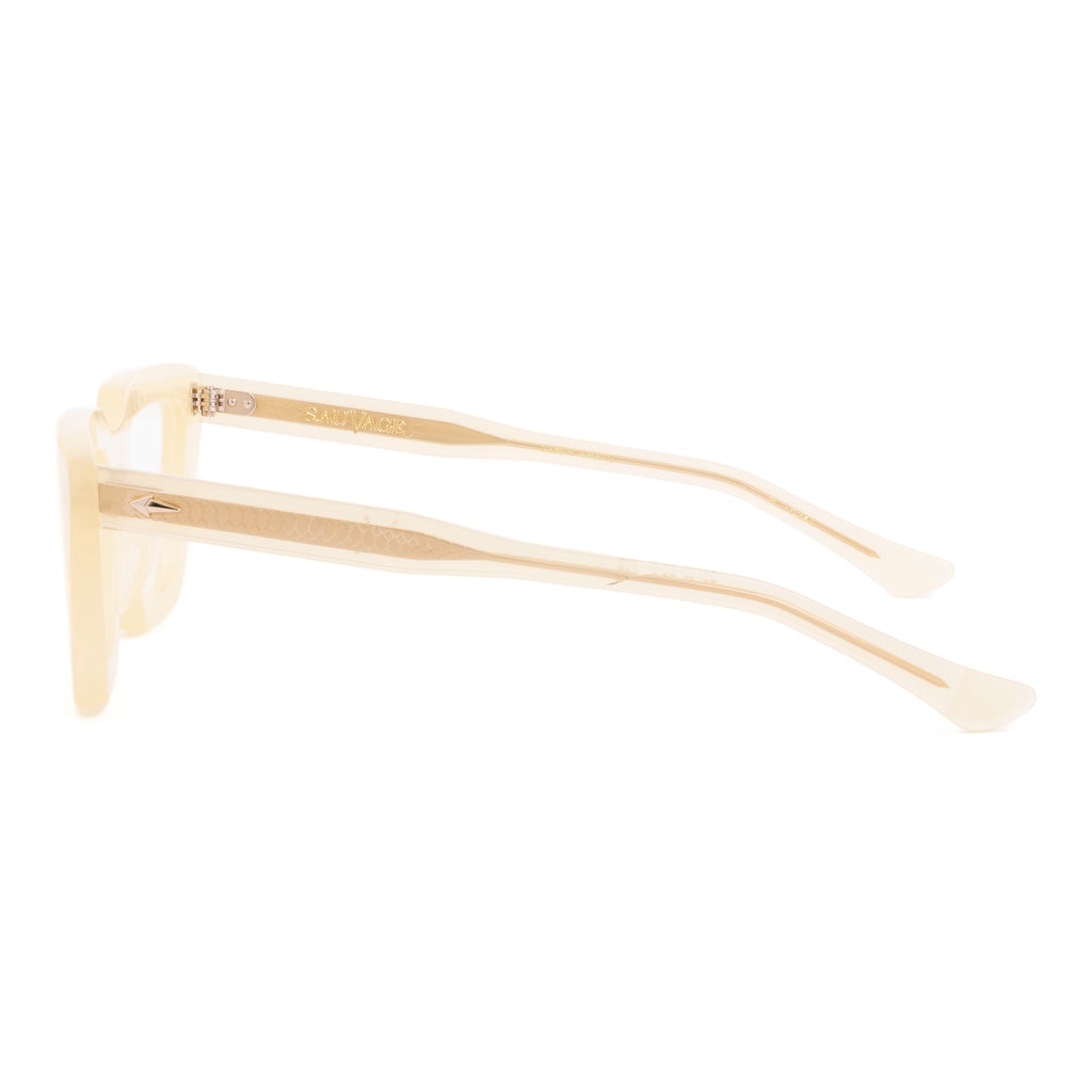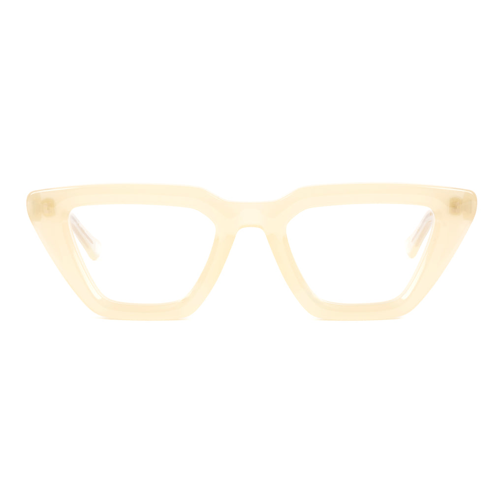 A trapezoidal shape frame drawn with straight lines, features thickened rims at the temples that are inspired by the swan's tail.